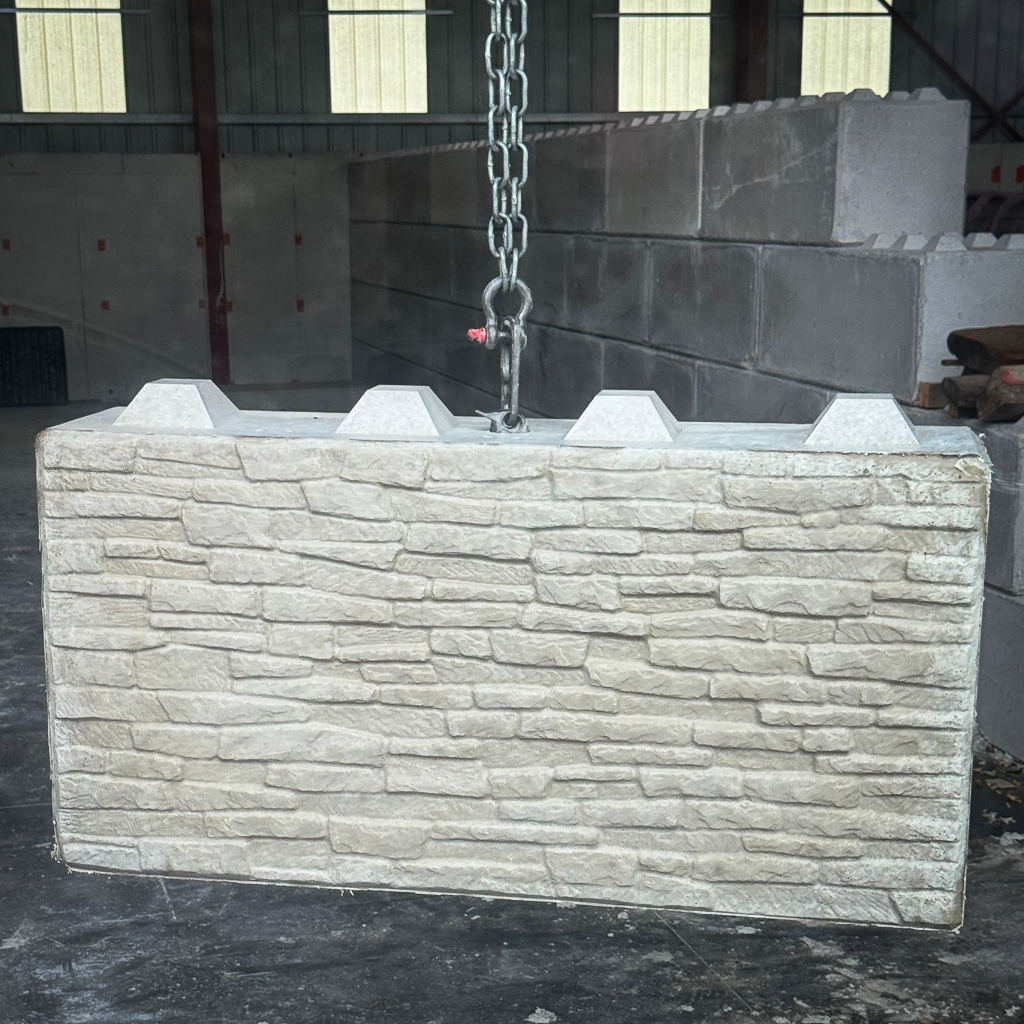 Nos blocs sont équipés d'ancres à tête hémisphérique compatibles avec les anneaux de levage Artéon, permettant un déplacement facile et sécurisé des blocs grâce à une grue ou un engin adapté. Nous pouvons aussi prévoir un emplacement pour fourche afin de les déplacer avec un chariot élévateur ou un transpalette.